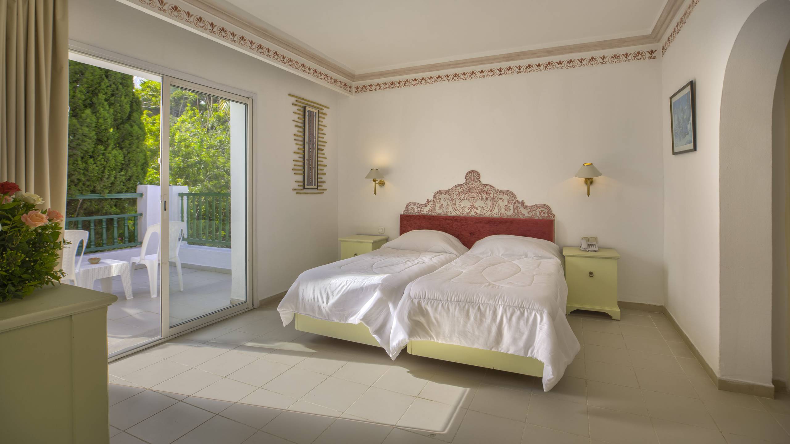 Die Zimmer sind ausgestattet mit Doppelbett, Bettwäsche, Handtücher und Matratzen aus 100% Bio-Baumwolle, 1 Bad, Dusche oder Badewanne, WC, Haartrockner, Klimaanlage, ca. 15.6.-15.9., TV (Sat-TV), WLAN, Balkon oder Terrasse.