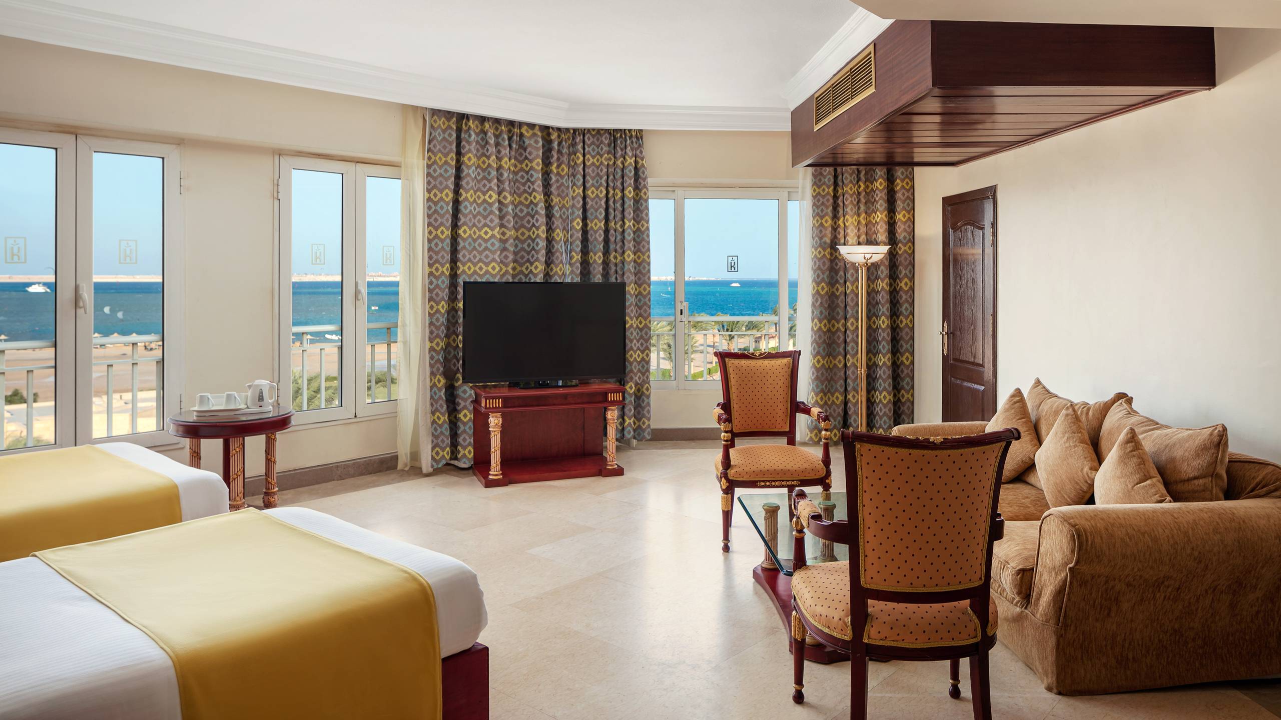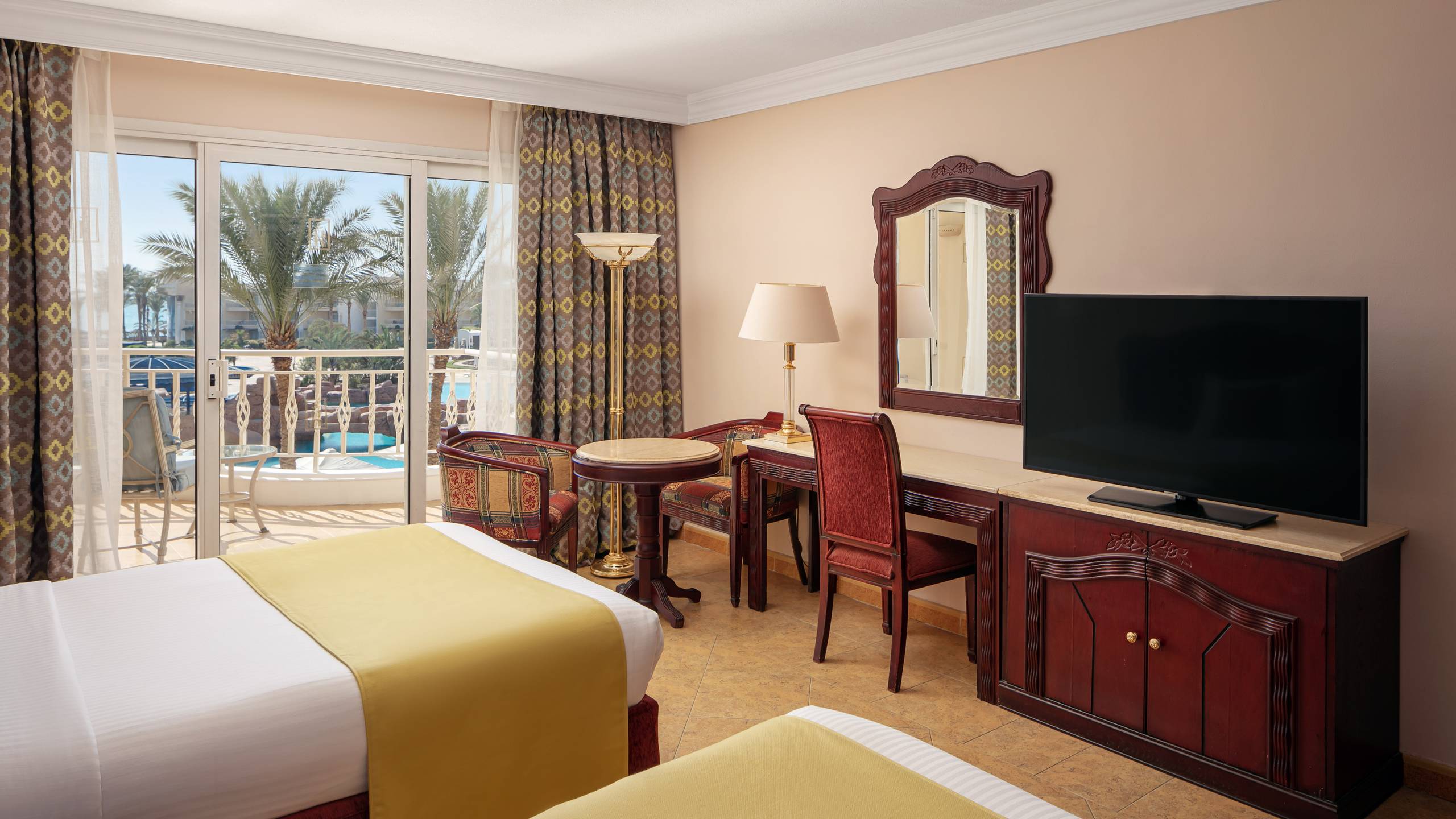 Wahlweise auch mit Poolblick (DSP/ESP/TSP) oder Meerblick (DSS/ESS/TSS) buchbar. Außerdem gibt es Superior Meeresfront Doppelzimmer (DSF/ESF/TSF). Familienzimmer haben Meerblick und sind mit Verbindungstür (F3M/FZM).