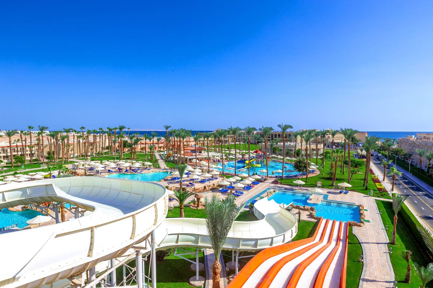 Im abwechslungsreich gestalteten Außenbereich finden Sie die Poollandschaft bestehend aus 10 Süßwasserswimmingpools (2 davon im Winter beheizt, 1 Kinderpool beheizt im Winter) sowie Pools mit Rutschen für Kinder und Erwachsene und den umgebenden Sonnenterrassen. Liegen, Auflagen, Sonnenschirme und Badetücher sind am Pool und Strand inklusive, außerdem gibt es am Strand eine Beachbar.