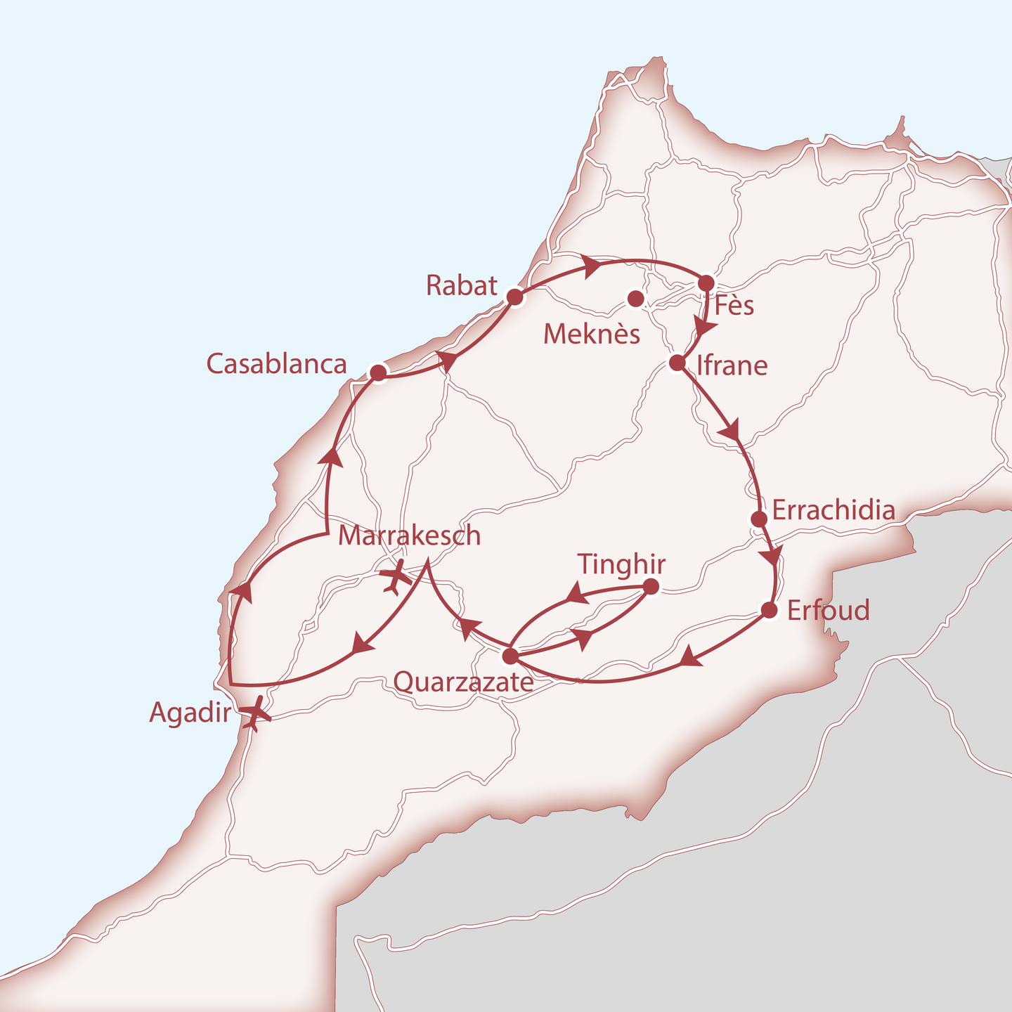 Am späten Vormittag treten Sie die Rückreise nach Agadir an. Transfer zum Flughafen oder Weiterfahrt zum gebuchten Hotel für einen Verlängerungsaufenthalt.
